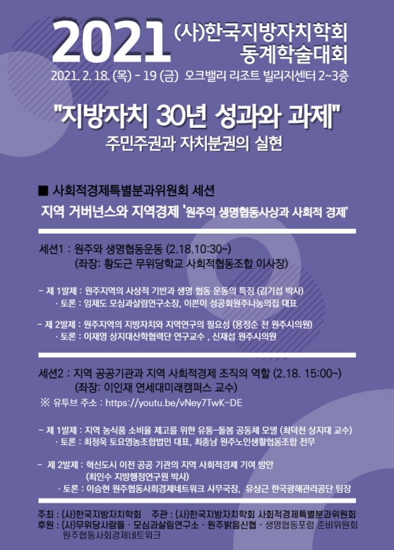 2021 (사)한국지방자치학회 동계학술대회 사회적경제특별분과위원회 세션 “지역 거버넌스와 지역경제 – 원주의 생명협동사상과 사회적경제”