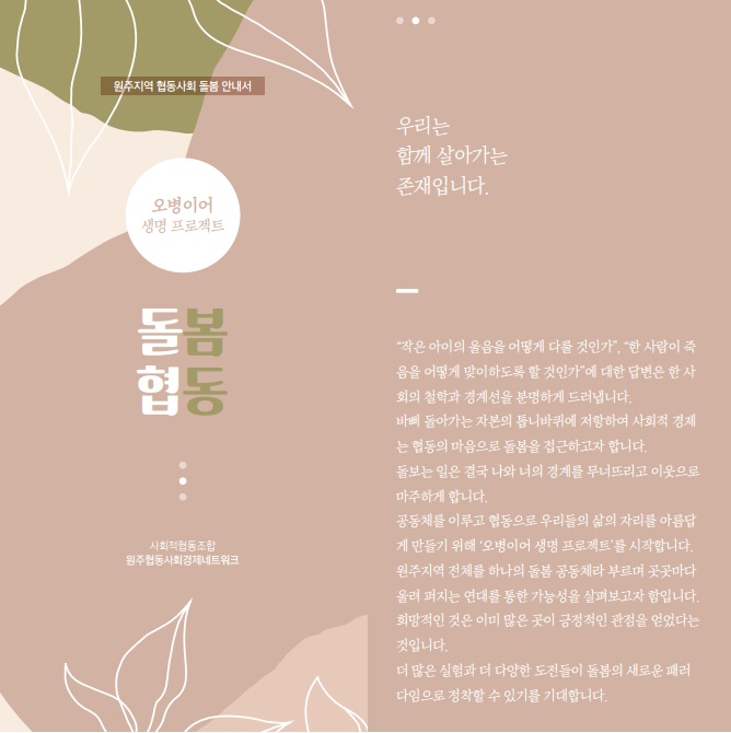 오병이어 생명 프로젝트 - 돌봄협동 ![]() 협동사회 돌봄 “오병이어 생명 프로젝트”란? 원주 지역 모든 구성원들이 전 생애주기 동안 존엄한 삶을 영위하고 생명을 존중하는 공동체를 만들어 가기 위하여, 원주협동사회 돌봄사업 단체들이 서로 협조하여 ‘지역돌봄 플랫홈’을 만들고 인간 존엄 존중, 인간적 돌봄을 추진하기 위한 활동입니다.