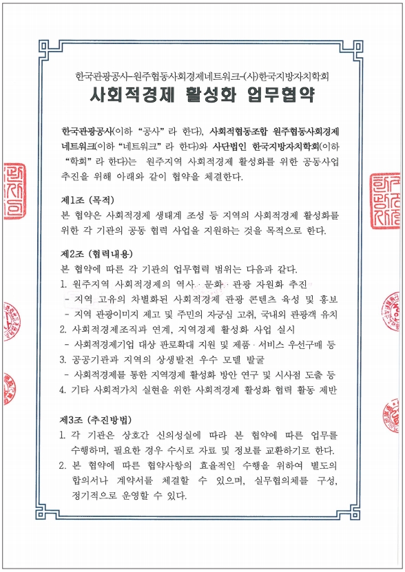 협약기간 2020.10.05. ~ 2021.12.31.(서면해지 통보가 없을 경우 1년씩 자동 연장) 협약내용 - 원주 사회적경제의 관광 자원화 및 홍보 - 사회적경제조직 연계 지역경제 활성화 사업 실시 - 공공기관과 이전지역의 상생발전 우수 모델 발굴 및 사업성과로부터 지역발전의 정책적 제도적 시사점 도출 등