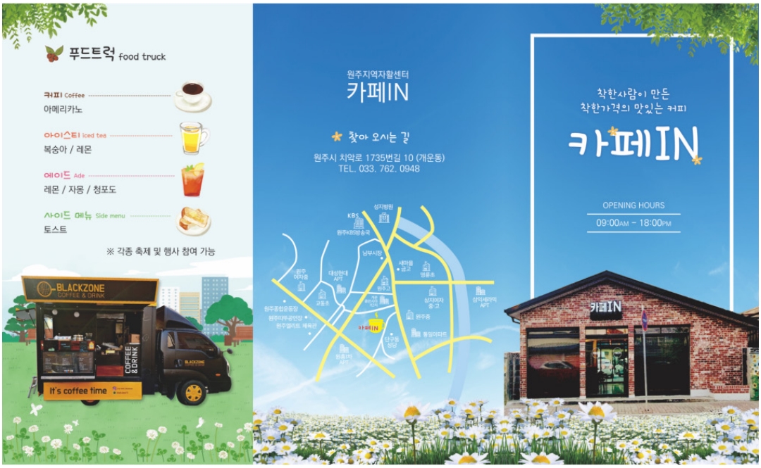 “착한사람이 만든 착한가격의 맛있는 커피 – 카페 IN” 카페IN은 원주시 관내 저소득 주민의 자립 및 자활과 삶의 질 향상을 위해 원주지역자활센터에서 운영하고 있습니다. 착한사람이 만든 착한가격의 맛있는 음료를 맛보실 수 있습니다. 케이터링도 가능하니 필요하신 분들 연락주세요. 간단한 음료와 토스트를 제공할 수 있는 푸드트럭을 장만했습니다. 각종 축제 및 행사 참여도 가능합니다. *50잔 이상 케이터링 가능