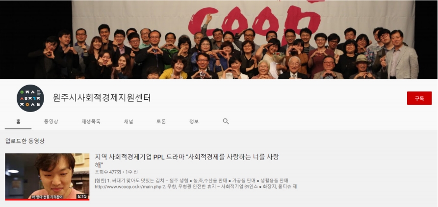 코로나19로 인해 사회적경제가 많은 어려움을 겪고 있습니다. 사회적경제 조직들에게 웃음을 드리고 사회적경제를 모르는 시민들에게 홍보할 수 있는 원주지역 사회적경제 기업과 그 제품들을 대놓고 홍보하는 본격 PPL 드라마를 제작했습니다. 앞으로 유튜브 채널 원주시사회적경제지원센터를 통해 사회적경제 관련 영상을 올릴 예정입니다. 구독(유튜브)과 좋아요(엄지)로 여러분의 관심을 보여주세요! ![]() 영상 제작 감독 : 이정호(길터 사회적협동조합 조합원) 주연(남) : 이재범(원주협동사회경제네트워크 사무국 회계 및 생생마켓 담당) 주연(여) : 김이석(원주시사회적경제지원센터 협동조합 설립 및 지원 담당) 조연 : 원주협동사회경제네트워크 사무국 & 무위당학교 사회적협동조합 사무국 제작 : 원주시사회적경제지원센터